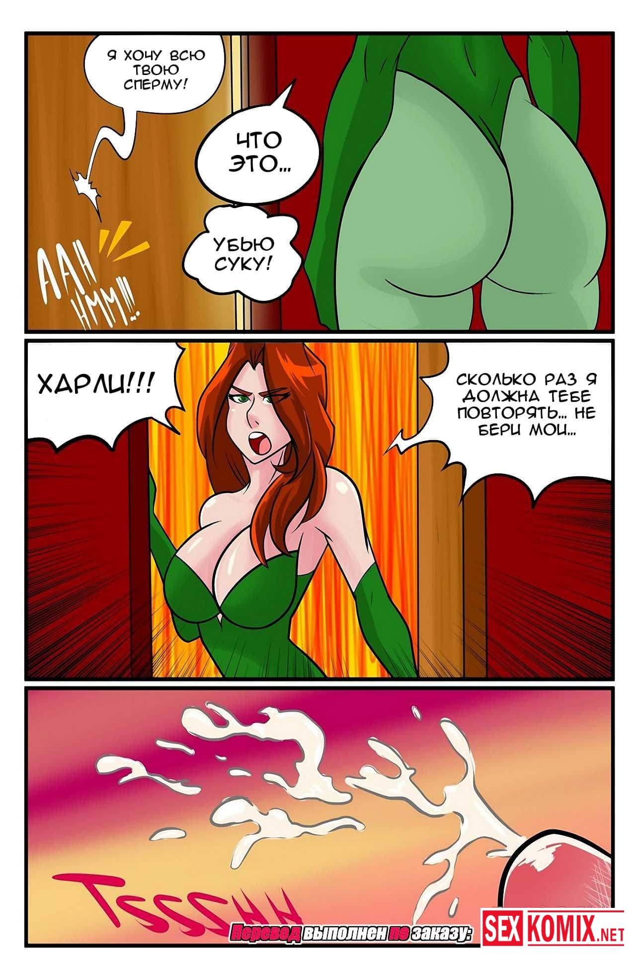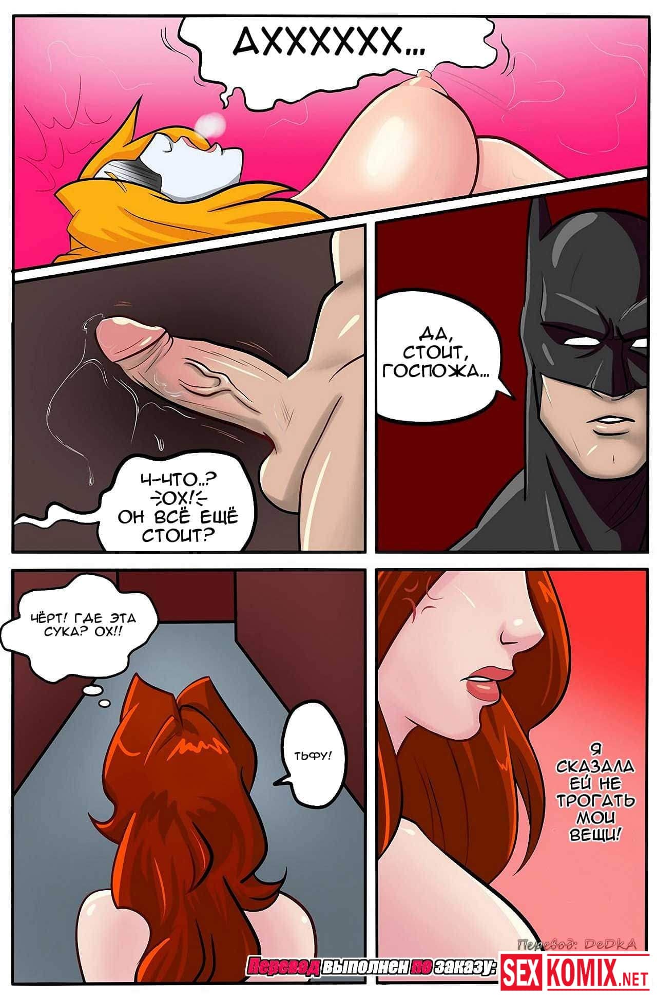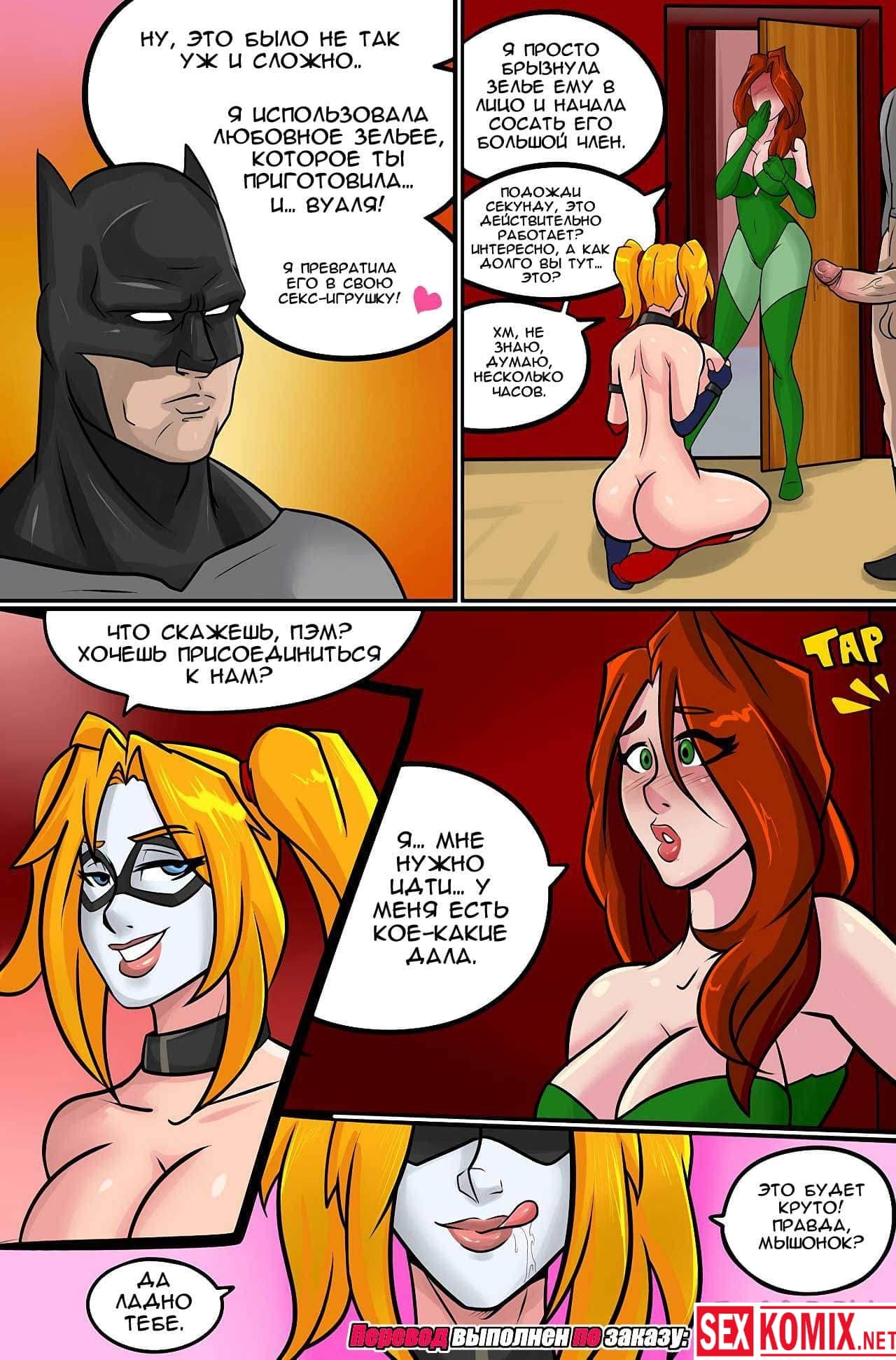 Порно комикс Сексуальные игры Харли Квинн. Хитрая и очень развратная злодейка украла у своей подруги возбуждающий газ. И отправилась к самому желанному супер-герою. Когда Харли встретилась лицом к лицу с Бетменом, она выпустила газ в его лицо и мужчина ощутил желание секса. Он снял с красотки одежду и начал её трахать.
