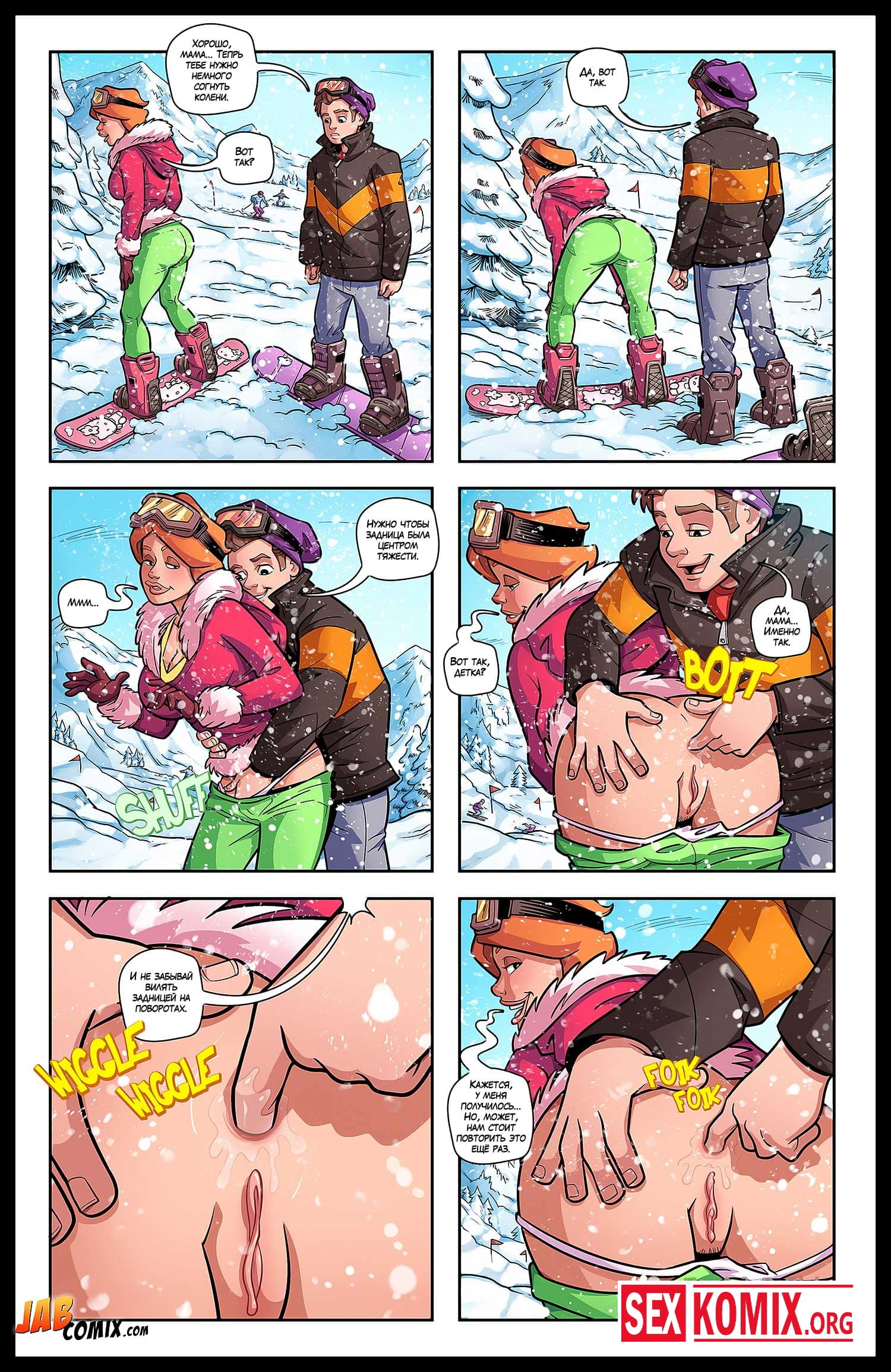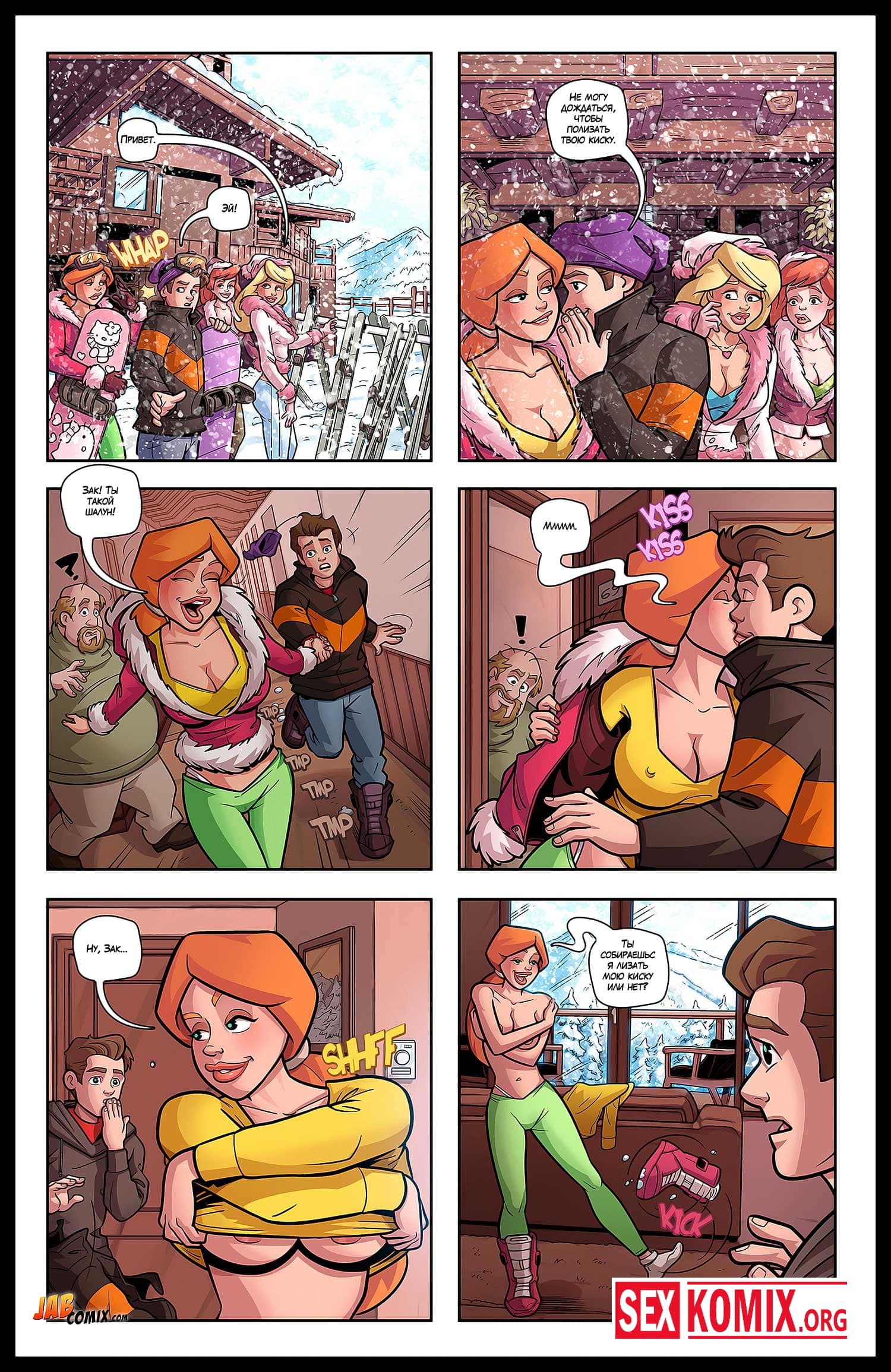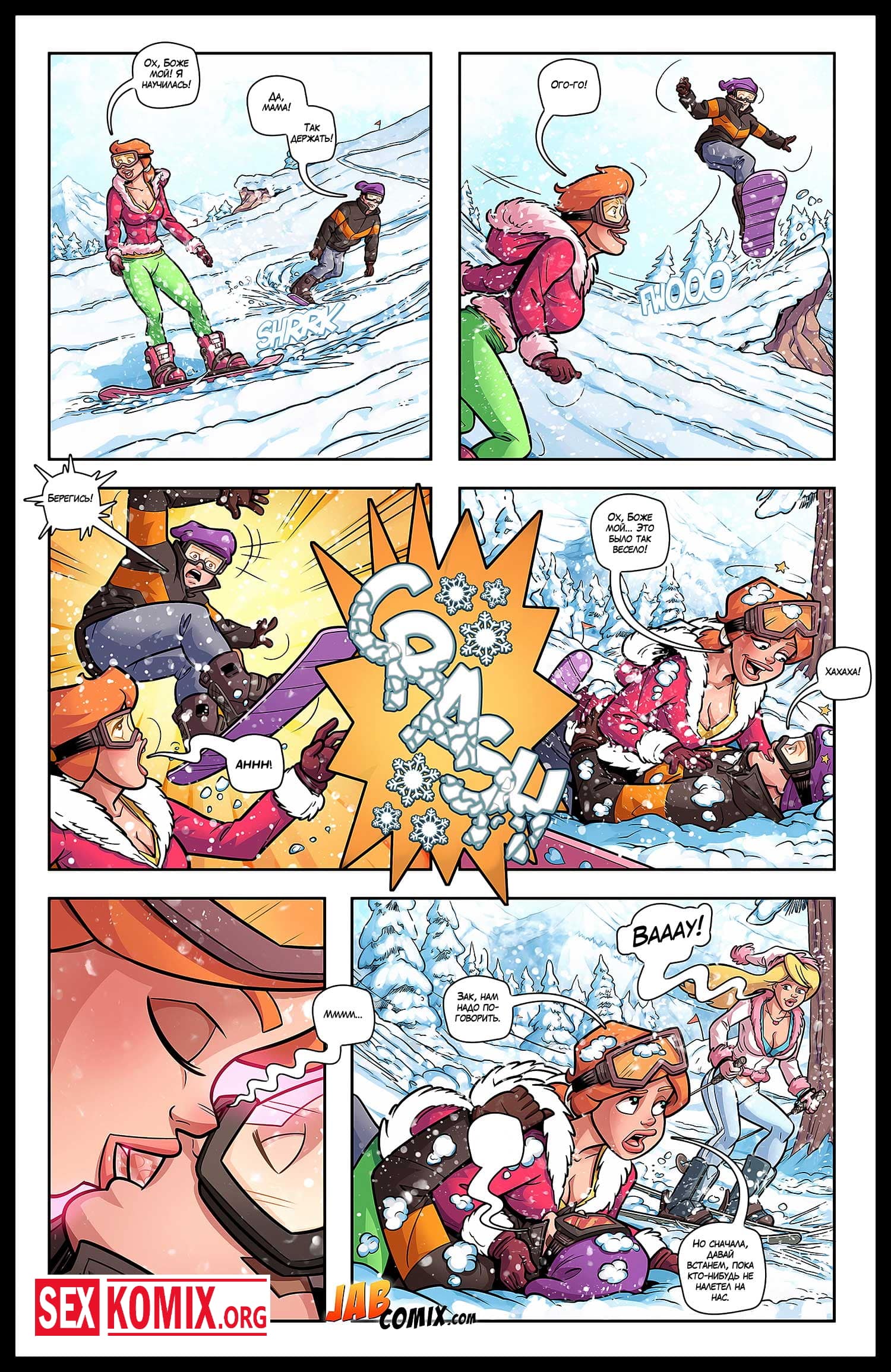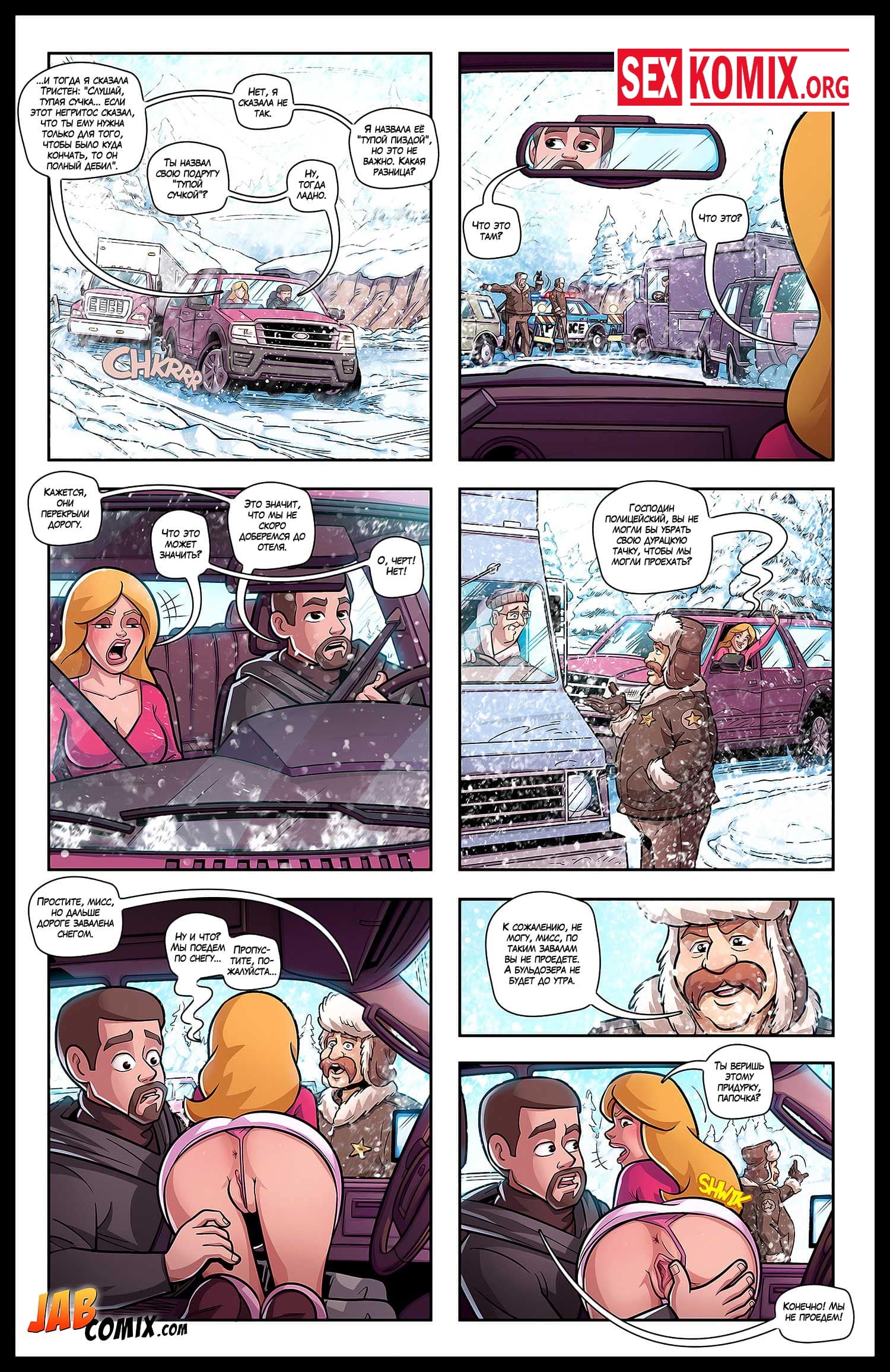 Порно комикс В снегах. Парень со своей сексуальной девушкой и лучшим другом поехал на зимний курорт в горы, чтобы покататься на лыжах. После нескольких дней катания на лыжах они поехали в магазин и застряли в снегу у дороги. Парень отправился за помощью, а его девушка и друг остались вместе в машине, чтобы согреться они прижались друг к друга. От прикосновения появилось возбуждение, желание захлестнуло их и они занялись сексом.
