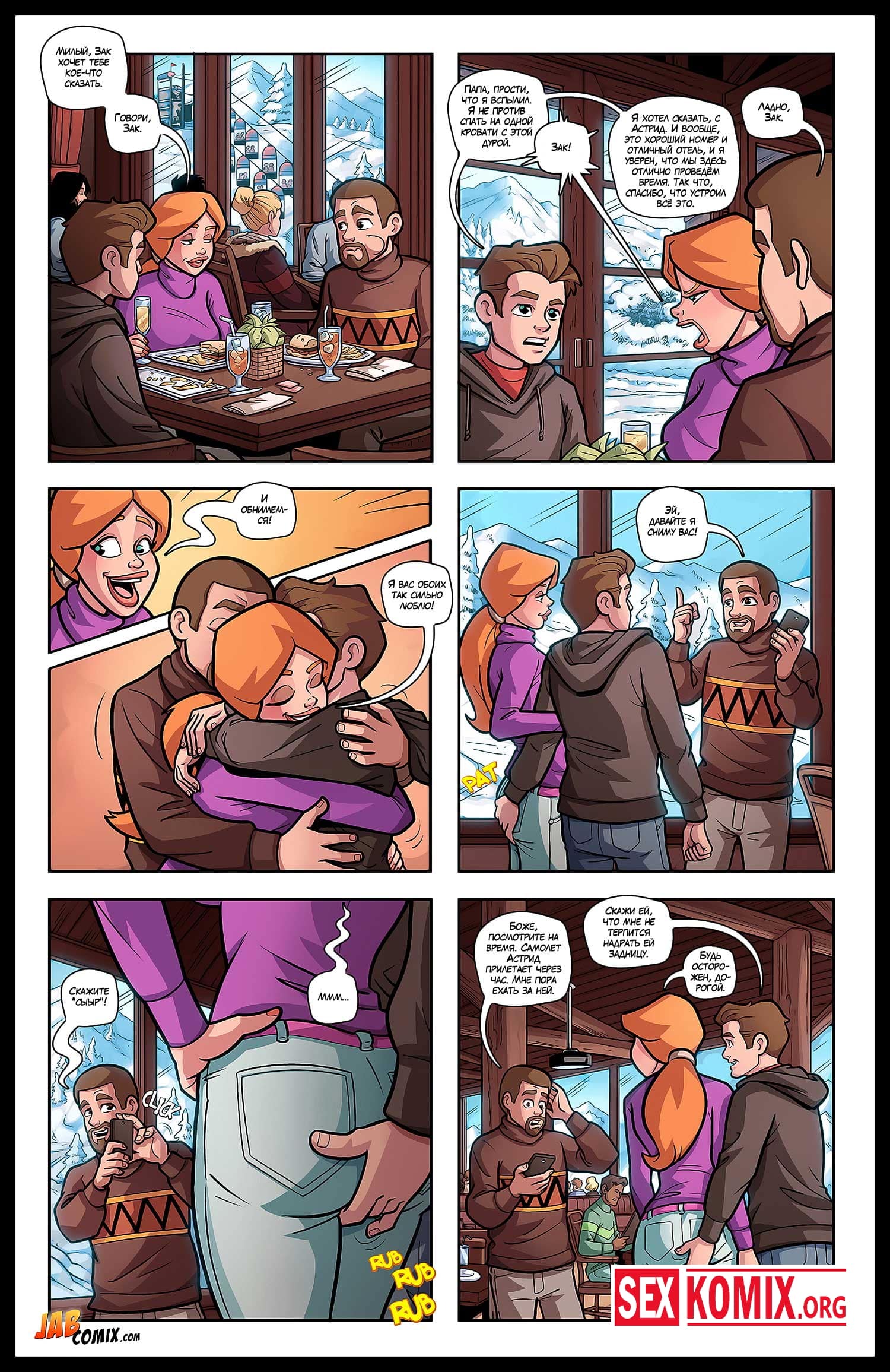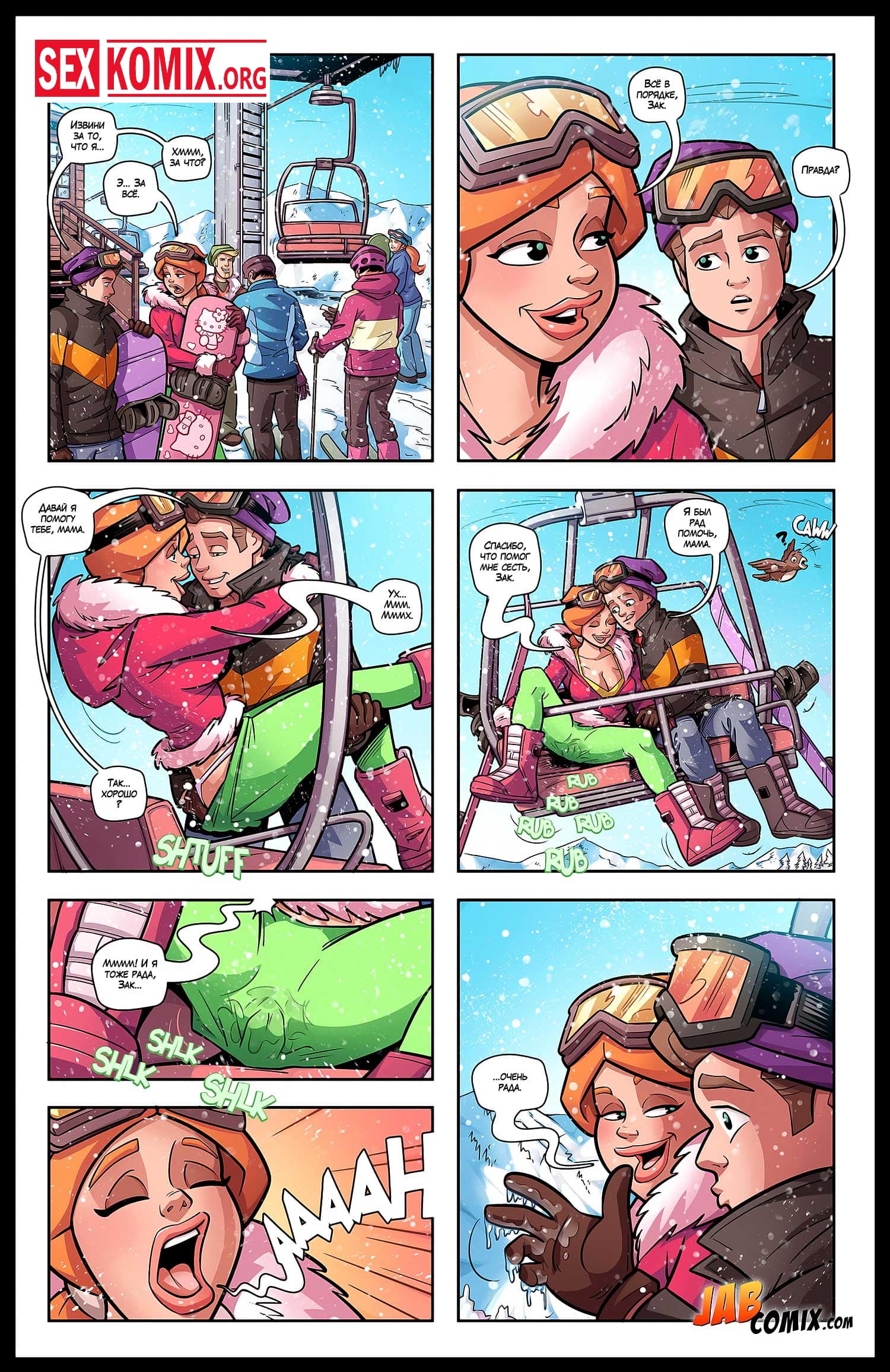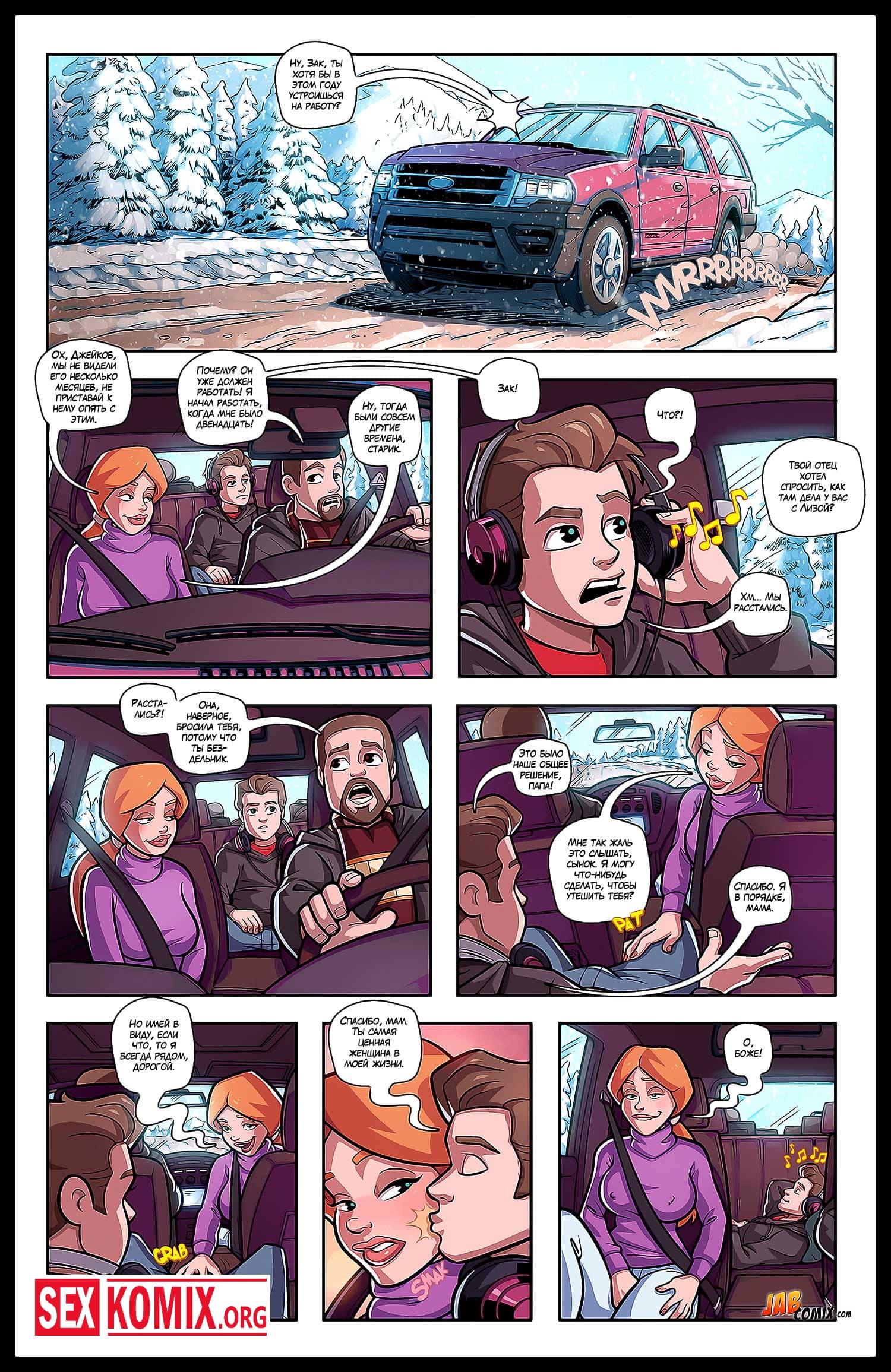 Порно комикс В снегах. Парень со своей сексуальной девушкой и лучшим другом поехал на зимний курорт в горы, чтобы покататься на лыжах. После нескольких дней катания на лыжах они поехали в магазин и застряли в снегу у дороги. Парень отправился за помощью, а его девушка и друг остались вместе в машине, чтобы согреться они прижались друг к друга. От прикосновения появилось возбуждение, желание захлестнуло их и они занялись сексом.