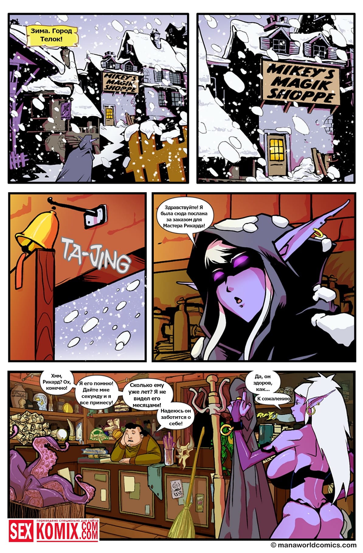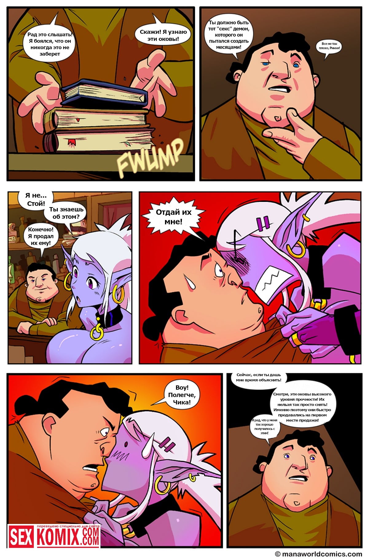 Порно комикс Мир маны. Магическая лавка Мики. Девушка эльф пошла в магазин, чтобы купить новый наряд для своих приключений. Хозяин этого магазина заметил шикарный формы своей посетительницы и предложил самые развратные наряды. Девушка мерила их, один был эффектней другого, а у Мики член становился с каждой примеркой тверже. В итоге он взял красотку, положил её на стол и трахнул.